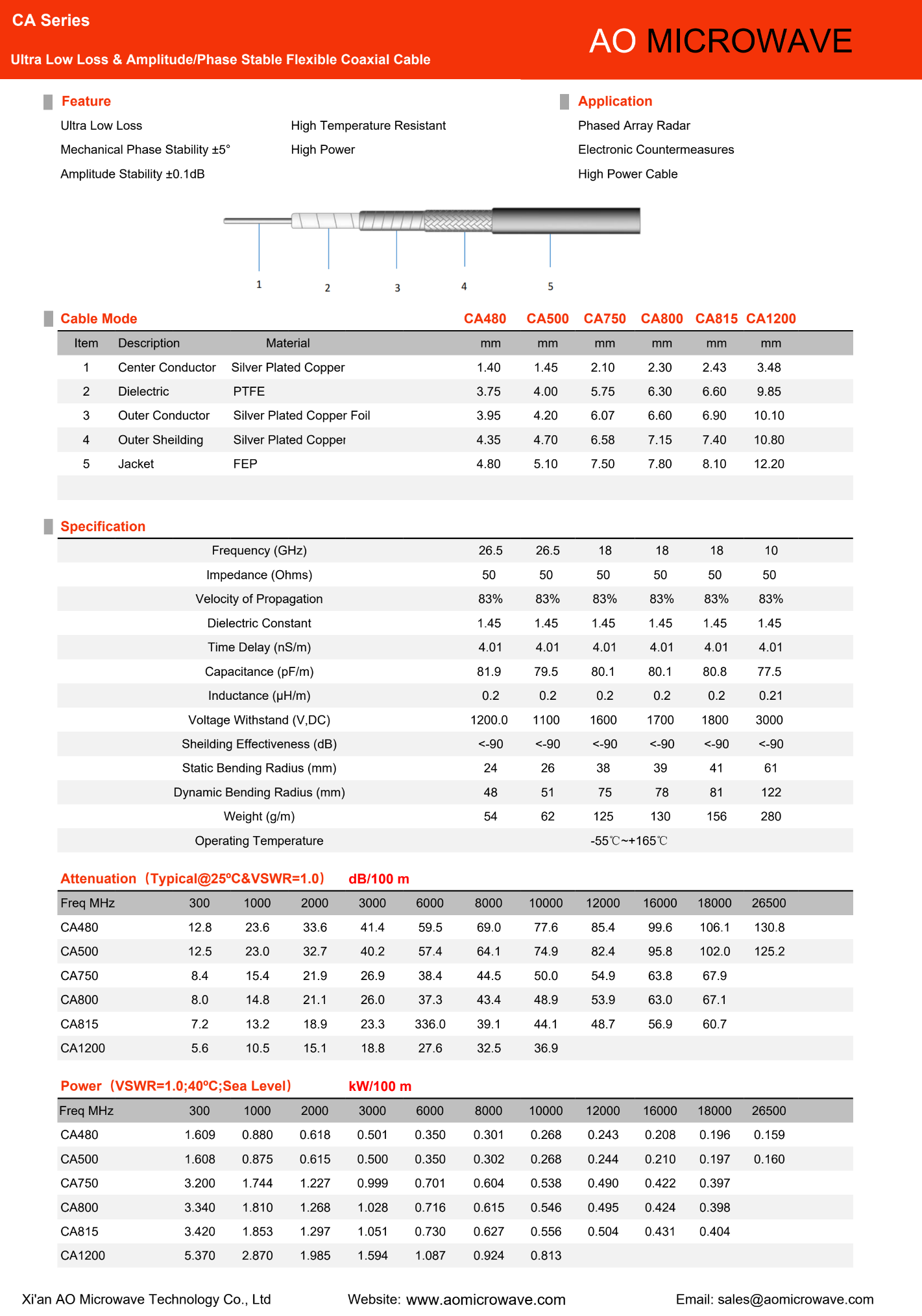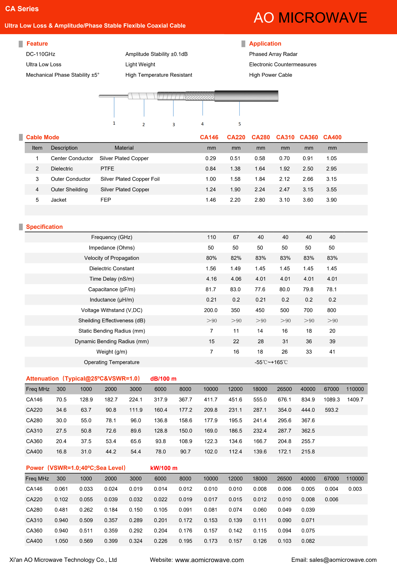 CA Series: Ultra Low Loss & Amplitude/Phase Stable Flexible Coaxial Cable is engineered for high-precision RF and microwave measurement systems requiring extremely low insertion loss and exceptional amplitude and phase stability. This high-performance RF cable assembly is widely used for vector network analyzer testing, antenna measurement systems, radar electronics, satellite communication equipment and 5G mmWave RF test environments where stable signal transmission and repeatable measurement accuracy are essential.