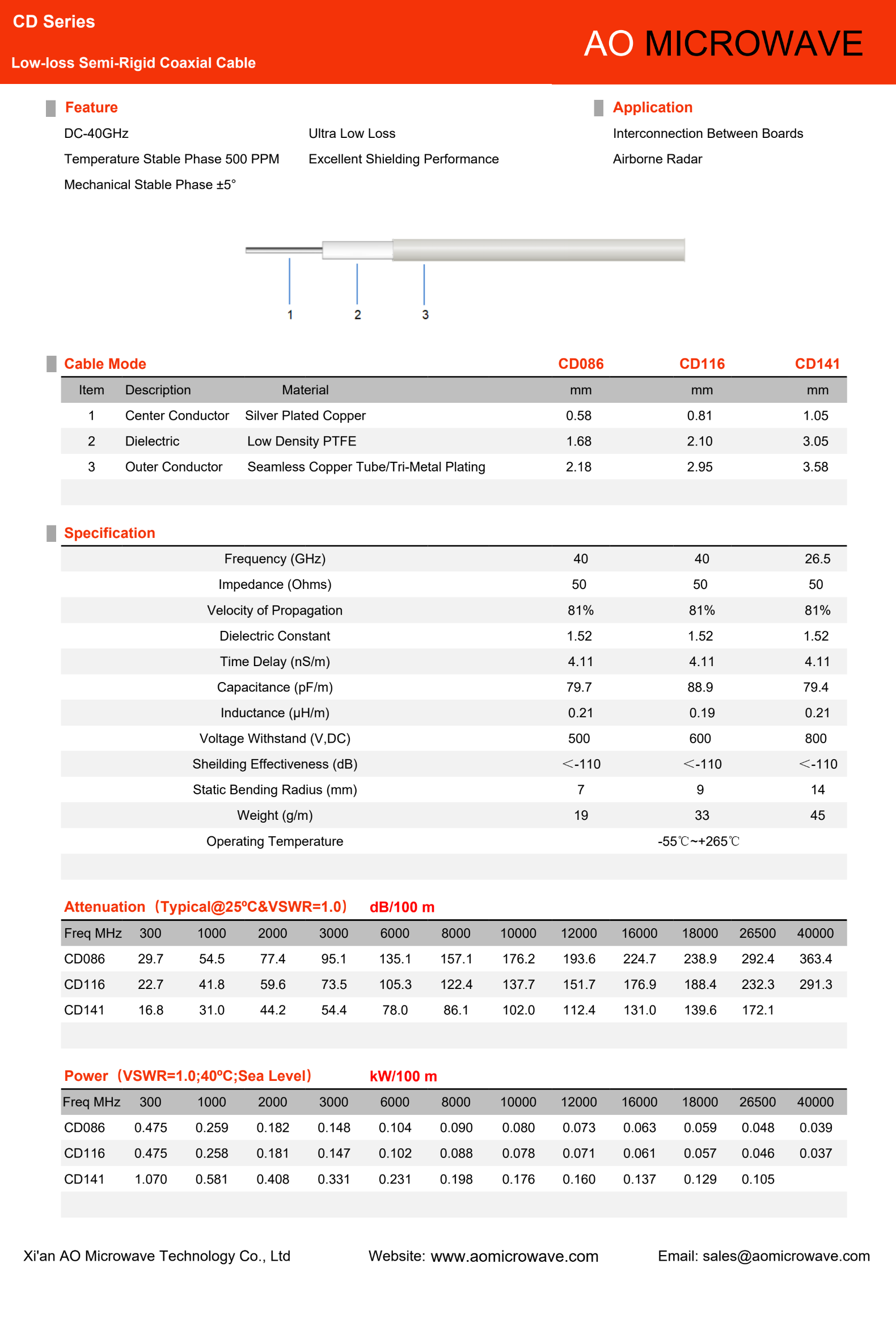 CD Series: Low-loss Semi-Rigid Coaxial Cable provides excellent shielding effectiveness, low RF attenuation and precise impedance stability for microwave and millimeter-wave applications. This semi-rigid RF cable is commonly used in radar systems, satellite communication equipment, RF modules, aerospace electronics and microwave assemblies requiring stable electrical performance and high signal integrity.