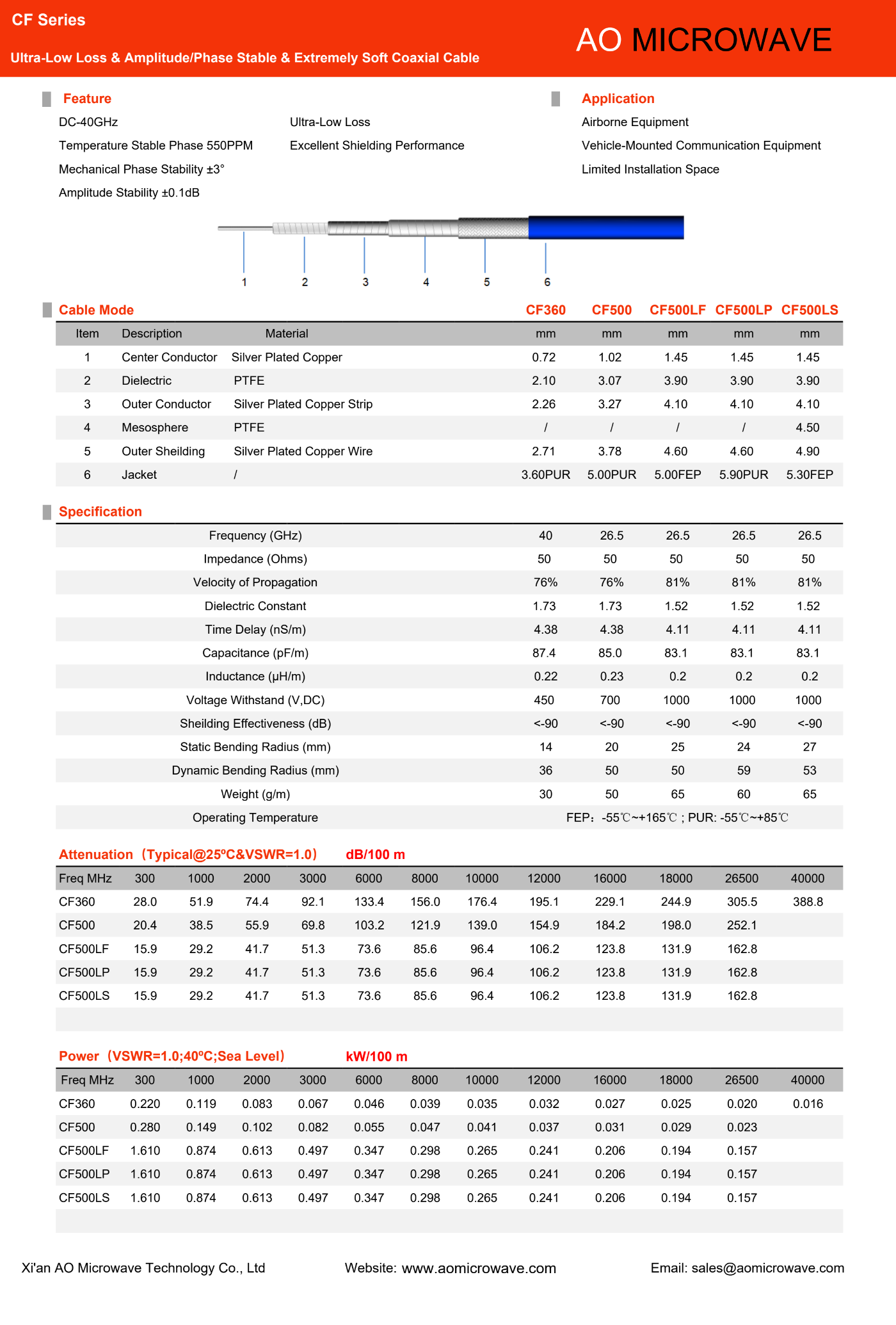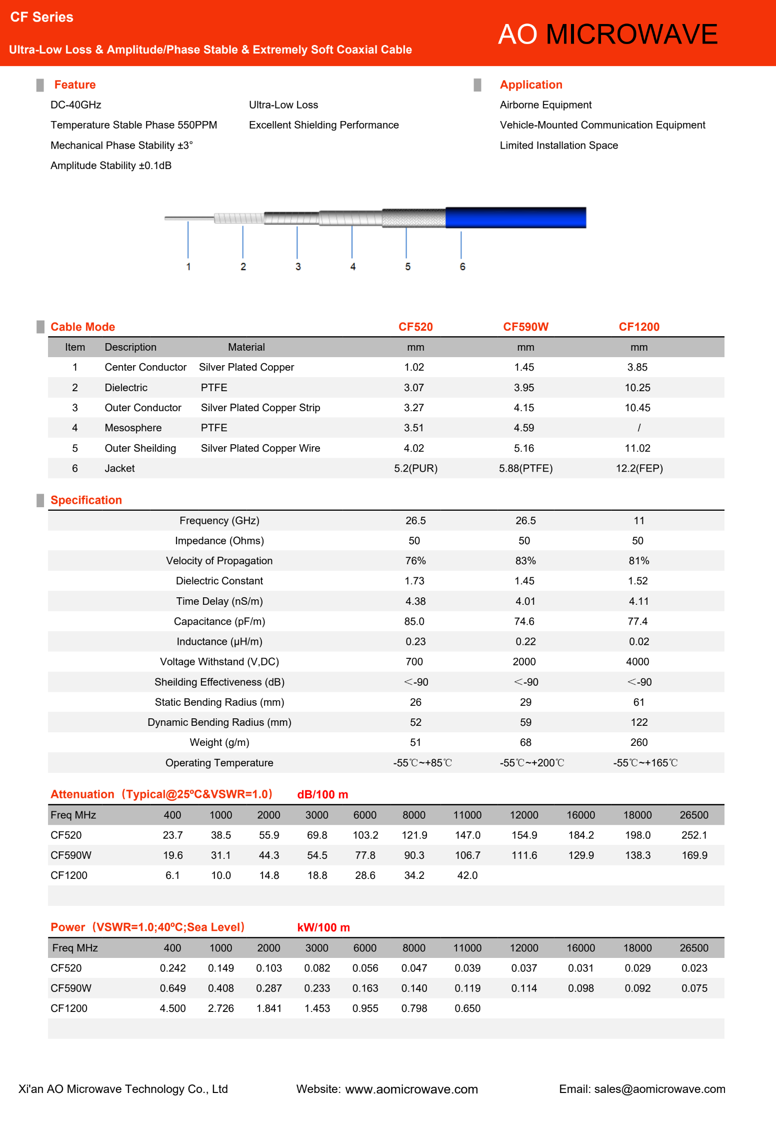 CF Series: Ultra-Low Loss & Amplitude/Phase Stable & Extremely Soft Coaxial Cable combines ultra-low RF signal loss with extremely flexible construction for demanding microwave testing environments. This phase stable RF cable is widely used in vector network analyzer testing, RF calibration systems, antenna measurement laboratories, microwave instrumentation and high-frequency RF communication testing.