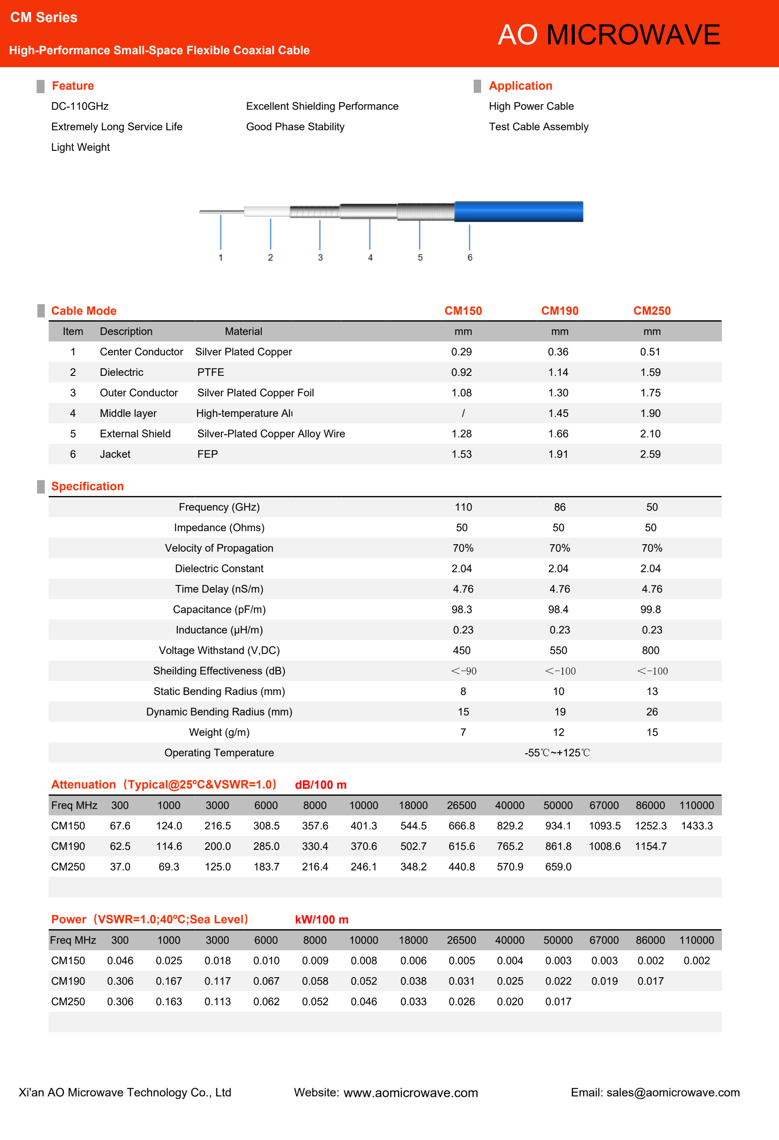 CM Series: High-Performance Small-Space Flexible Coaxial Cable is designed for compact RF modules and microwave systems where installation space is limited. This flexible coaxial cable provides reliable RF signal transmission, low loss and stable electrical performance, making it suitable for radar electronics, communication equipment, RF modules, microwave assemblies and satellite communication systems.